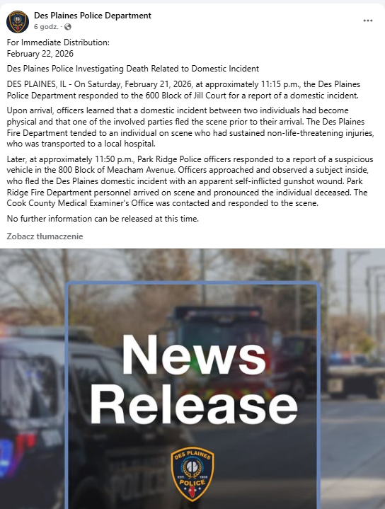 Policja z Des Plaines poinformowała, że na obecnym etapie nie będą przekazywane dalsze szczegóły dotyczące sprawy. Jeśli Ty lub ktoś z Twojego otoczenia potrzebuje pomocy w kryzysie, w USA dostępna jest bezpłatna linia wsparcia 988 (Suicide & Crisis Lifeline), czynna 24/7